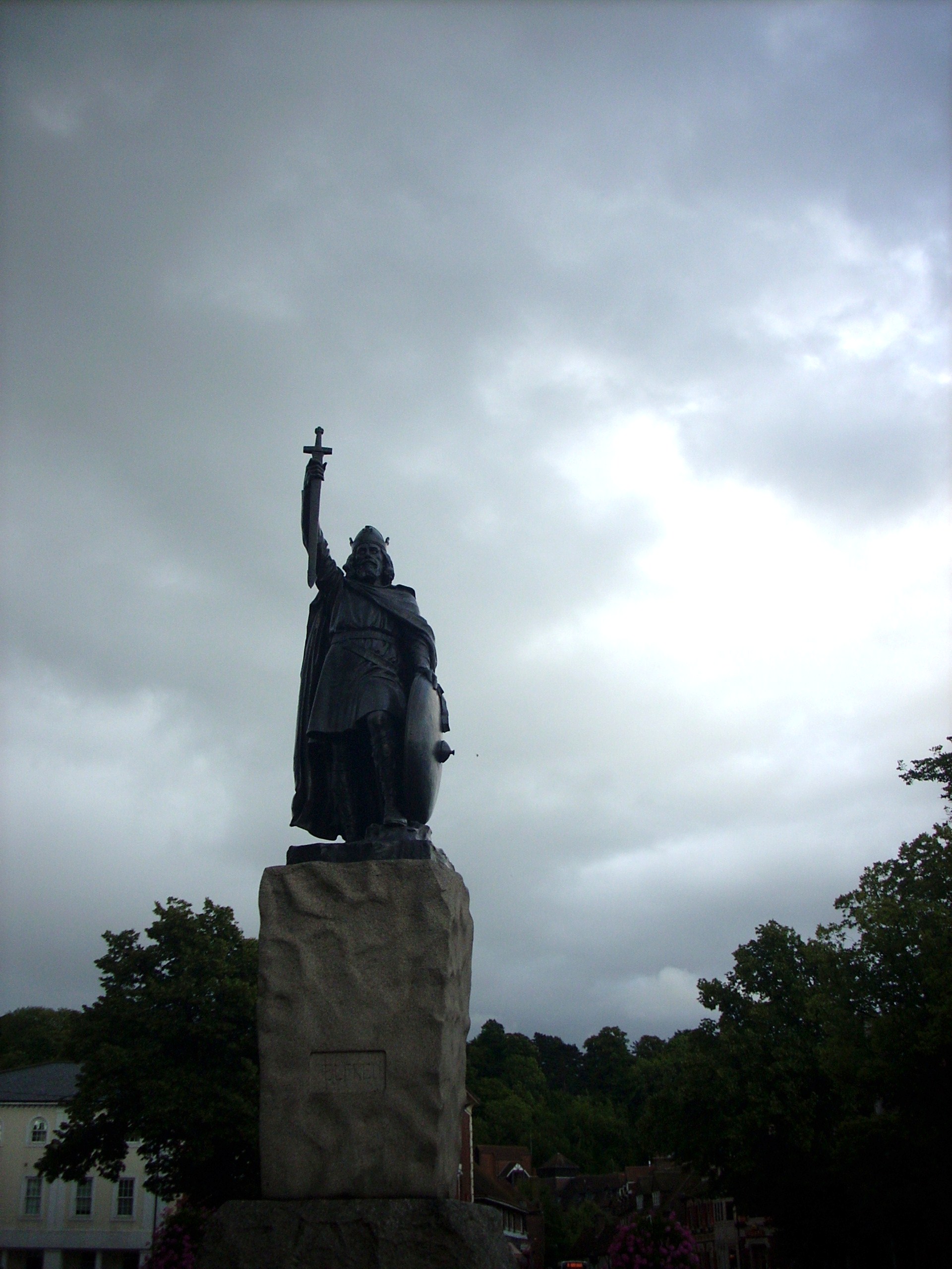 Upon reentering the town, I come across the statue the Veteran had told me about—but it is not King Arthur at all. It is a statue of King Aelfred the Great, an Anglo-Saxon king. Aelfred reigned from 871 to 899 and was renowned for his love of education and law. Quizzical, I look back to see if our aged Veteran might be nearby—had he meant Aelfred or Arthur? Was as it a matter of confusion between our American and British accents? But our Veteran has long disappeared into the labyrinth of wooded pathways surrounding the base of St. Giles Hill.