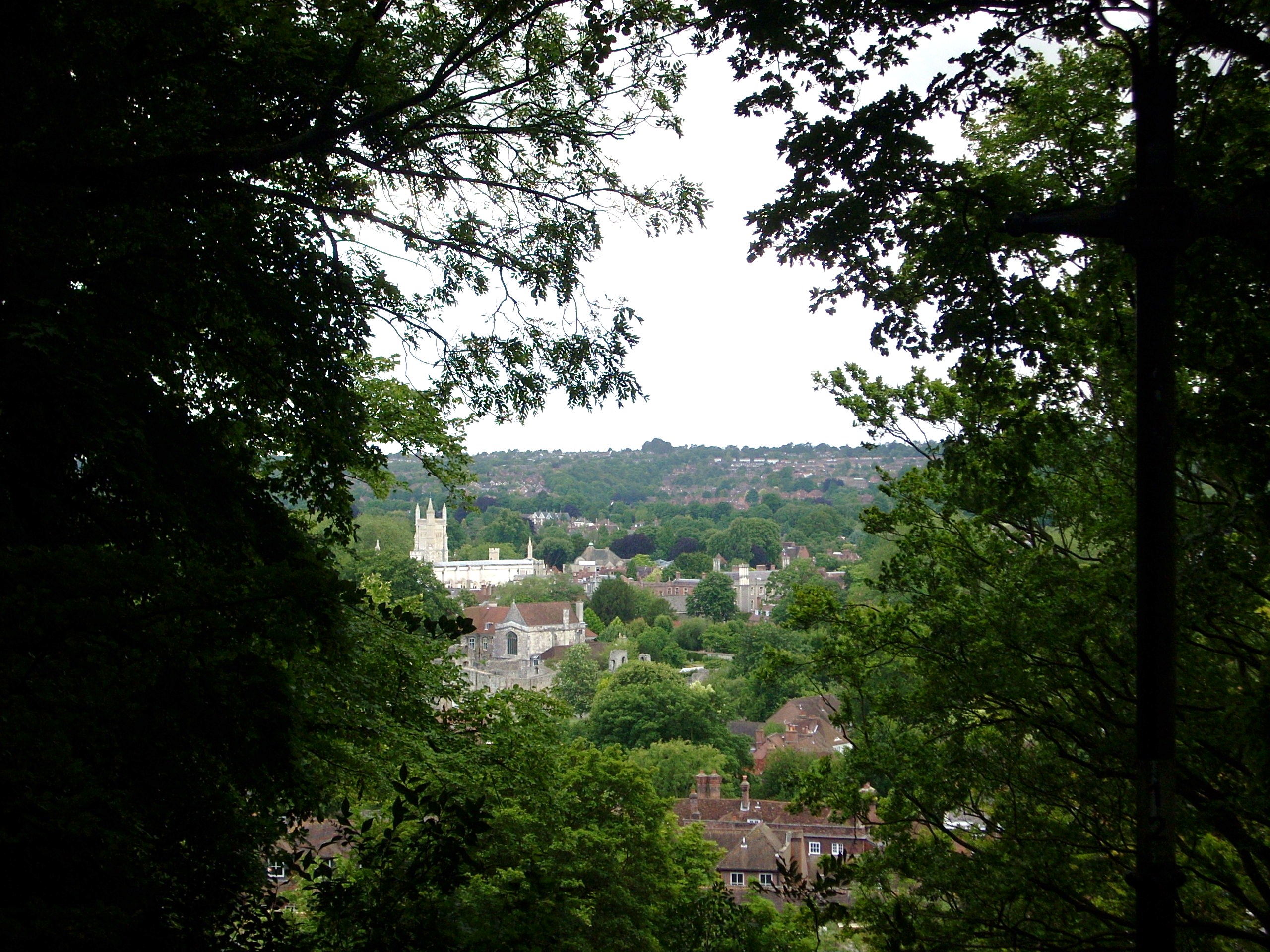 High above the city, under a sky threatening rain and lightening, St. Giles Hill in Winchester affords sweeping views of the townscape and landscape. Under my feet, an ancient roman stronghold. An elderly man, a World War II veteran that I met on the way up, told me that you could see the depressions where the Roman fort once stood. But I find no traces of the Roman fortress—only a softly mounded green hill, fringed with trees.
