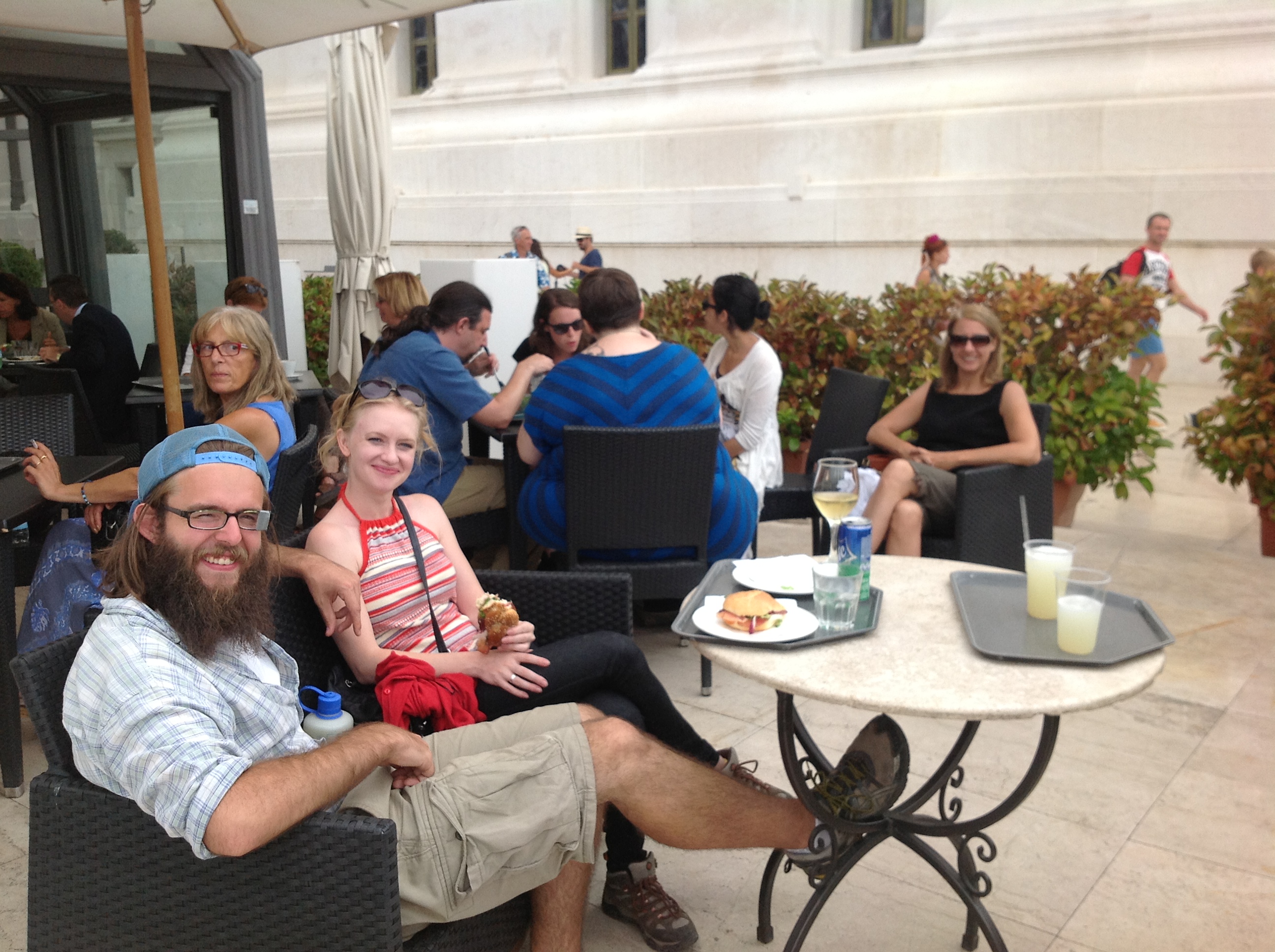 As we walked, he directed our attention to the various elements within a single fountain, a palace courtyard, the beautiful piazza Campidoglio (designed by Michelangelo), and then a dramatic overview of the Forum. Rome, he explained is a city of stratification and juxtaposition–a city where the architecture from one era is layered upon another, where marble columns are recycled into new uses, where buildings are joined together in surprising junctures. Winner of the prestigious Rome prize 30 years ago, he remained in Rome and has made his passion for this city his life work.