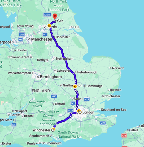 Winchester is in southern England, about 70 miles southwest of London. From here, Malory’s Arthur announces he will hold a parlement in York, over 200 hundred miles north, to determine his strategy in contesting Rome. Why set Arthur on this inexplicable route toward York? It’s hardly on the way to Rome. I’m already checking the train schedule from London to York.